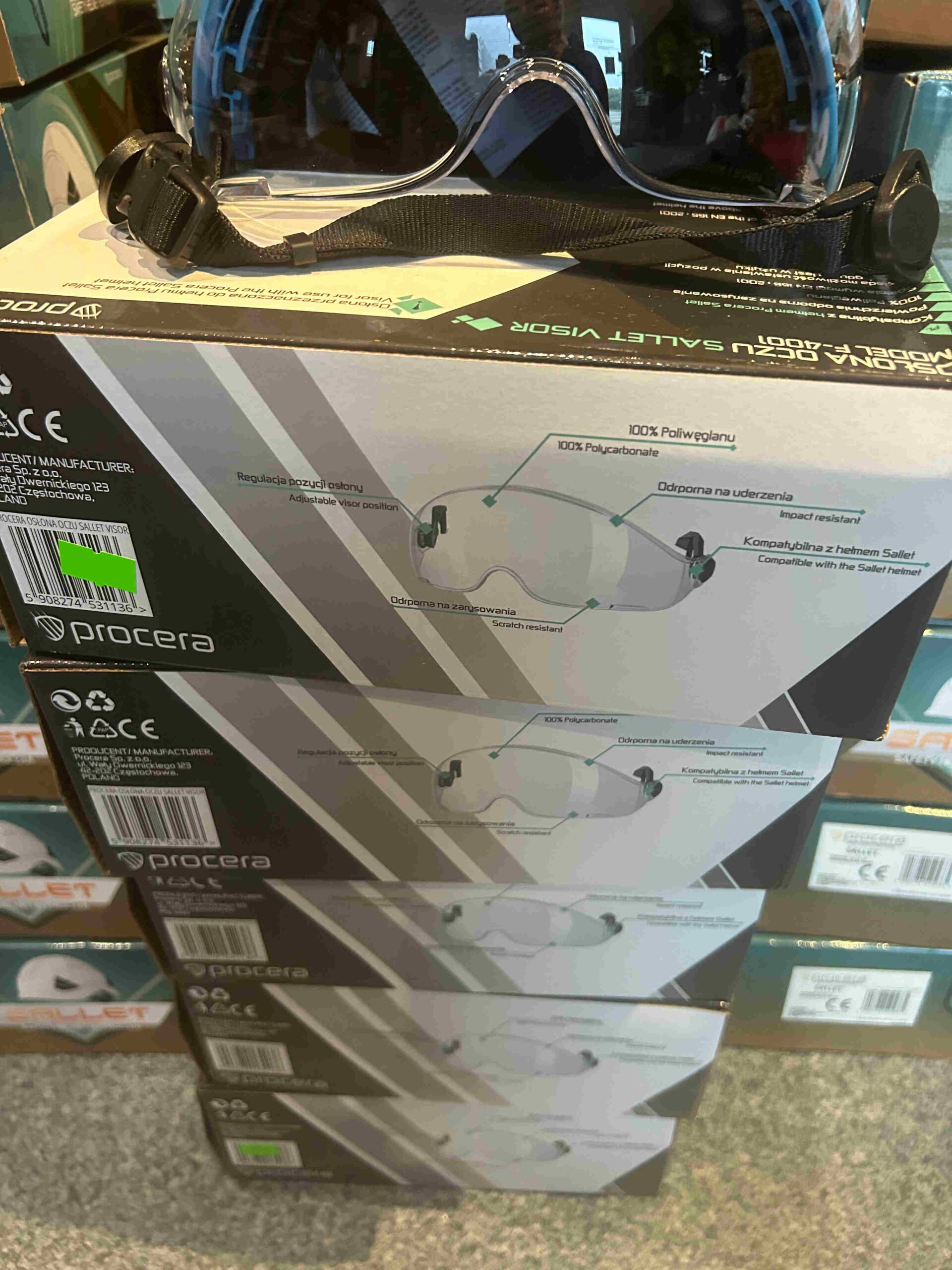 Osłona oczu Sallet Visor F-4001 przeznaczona do hełmu Sallet, przeźroczysta, wykonana z bezbarwnego poliwęglanu, z powłoką odporną na zarysowanie.